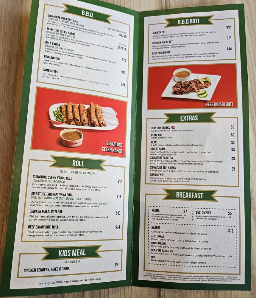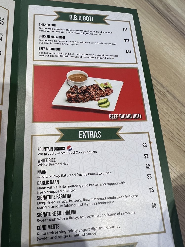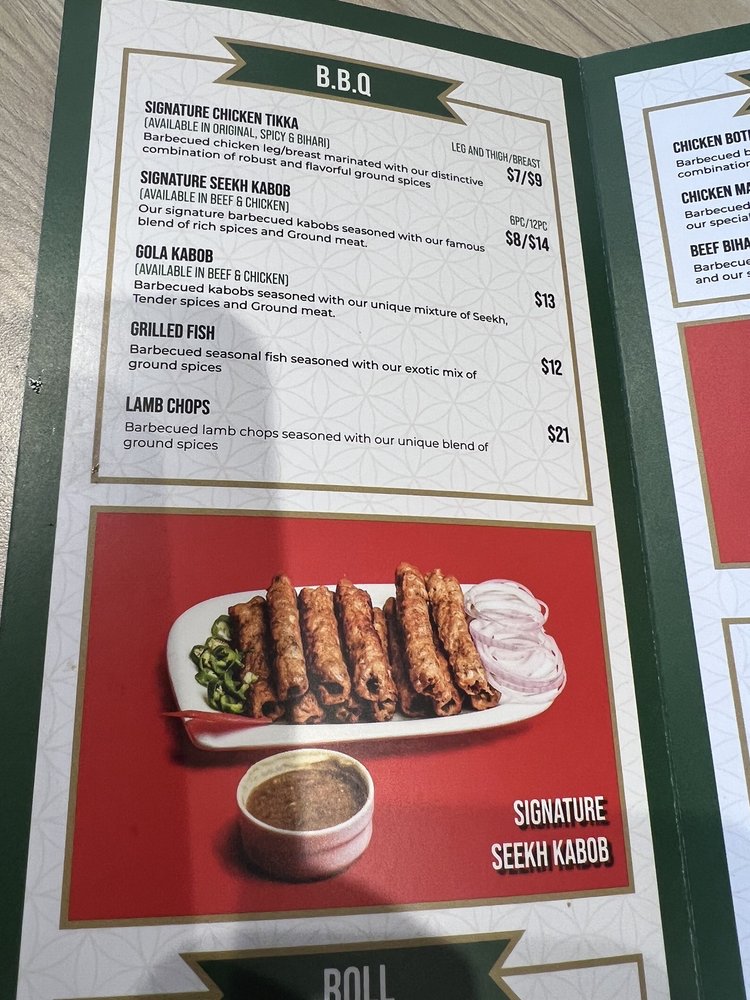 Beef Bihari Boti wrapped in our Signature Paratha with red onions and imli chutney (available in Naan as well).