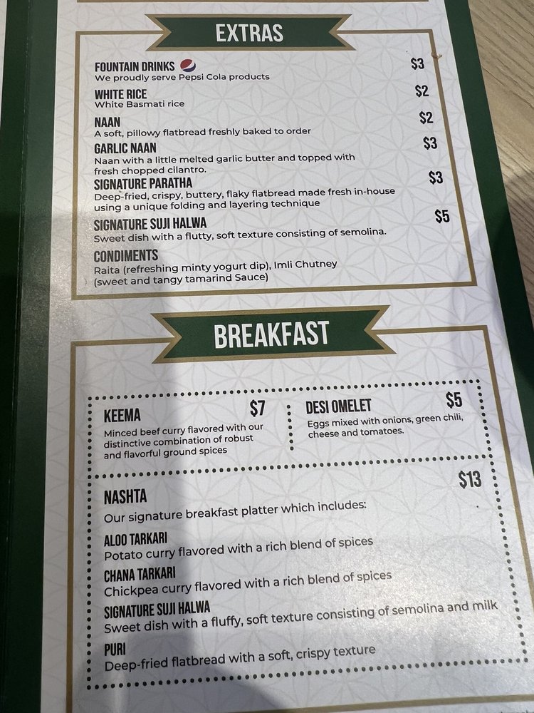 Our signature breakfast platter which includes: Chana, Aloo, Suji Halwa, and two Puris.
